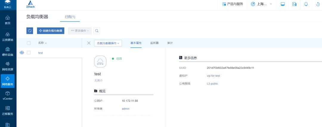 在ZStack私有云主菜单,点击网络服务中的负载均衡器,创建时选择公有网络,创建如下: