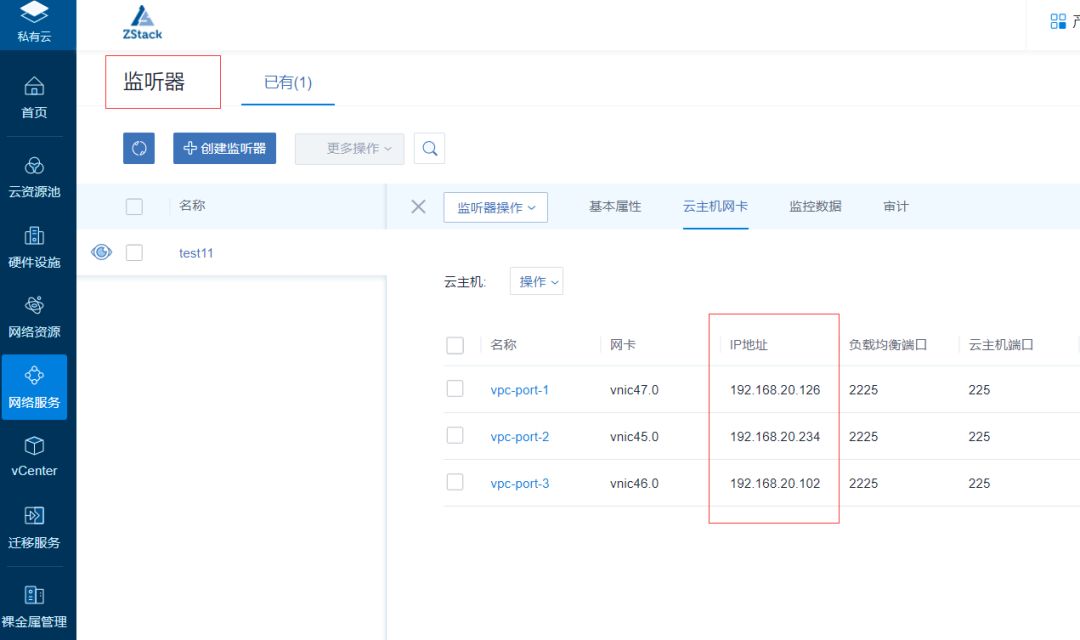 在网络服务界面,点击创建监听器,创建过程中选择我们刚才创建的负载均衡器,端口选择可以如下图,之后在监听器操作中选择绑定云主机网卡,完成如下: