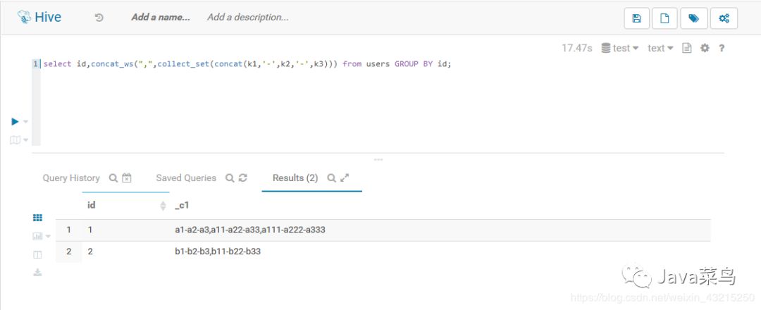 hive -e "SELECT id,concat_ws(',',collect_set(concat(k1,'-',k2,'-',k3))) from test.users GROUP BY id;" > users.data查看