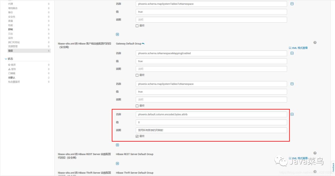 HBase → 配置 → 高级 → 搜索 hbase-site.xml。
