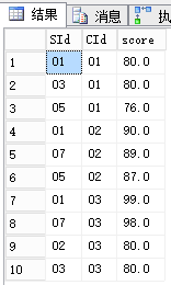 create table SC(SId varchar(10),CId varchar(10),score decimal(18,1))insert into SC values('01' , '01' , 80)insert into SC values('01' , '02' , 90)insert into SC values('01' , '03' , 99)insert into SC values('02' , '01' , 70)insert into SC values('02' , '02' , 60)insert into SC values('02' , '03' , 80)insert into SC values('03' , '01' , 80)insert into SC values('03' , '02' , 80)insert into SC values('03' , '03' , 80)insert into SC values('04' , '01' , 50)insert into SC values('04' , '02' , 30)insert into SC values('04' , '03' , 20)insert into SC values('05' , '01' , 76)insert into SC values('05' , '02' , 87)insert into SC values('06' , '01' , 31)insert into SC values('06' , '03' , 34)insert into SC values('07' , '02' , 89)insert into SC values('07' , '03' , 98)