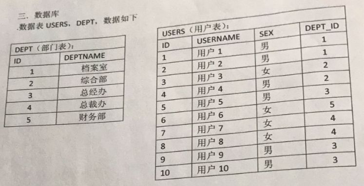 CREATE TABLE USERS([ID] [int] NOT NULL,[USERNAME] [nvarchar](50) NULL,[SEX] [nchar](10) NULL,[DEPT_ID] [int] NULL);insert into USERS values('1' , '用户1' ,'男',1);insert into USERS values('2' , '用户2' ,'男',1);insert into USERS values('3' , '用户3' ,'女',2);insert into USERS values('4' , '用户4' ,'男',2);insert into USERS values('5' , '用户5' ,'男',3);insert into USERS values('6' , '用户6' ,'女',5);insert into USERS values('7' , '用户7' ,'女',4);insert into USERS values('8' , '用户8' ,'女',4);insert into USERS values('9' , '用户9' ,'男',3);insert into USERS values('10' , '用户10' ,'男',3);