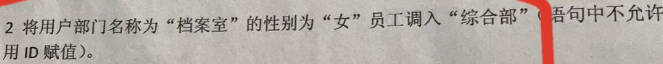 --2、将用户部门名称为“档案室”的性别为“女”员工调入“综合部”(语句中不允许用ID赋值);