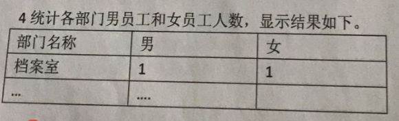 select case DEPT_IDwhen '1' then '档案室'when '2' then '综合部'when '3' then '总经办'when '4' then '总裁办'when '5' then '财务部'else '其他'end as 部门名称,count(case sex when '男' then 1 end) 男,count(case sex when '女' then 1 end) 女 from USERS group by DEPT_ID