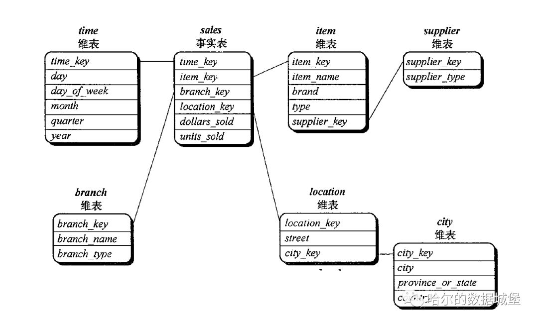 雪花模型:星形模型的变种,其中某些维表被规范化,因而把数据进一步分解到附加的表中。