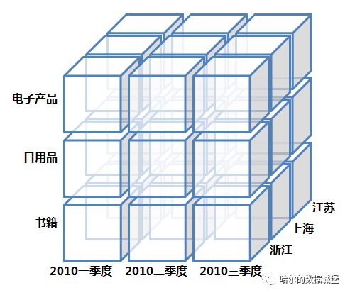 切片(Slice):在给定的立方体的一个维上操作。比如选择time=‘2010第一季度’,对time维选择销量数据。