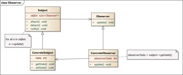 Subject接口,负责管理观察者列表的增加、删除和发送通知操作;ConcreteSubject类实现Subject接口;Observer接口是观察者接口,update方法是当被观察者的状态发生变化后调用的;ConcreteObserver类是Observer接口的具体实现。