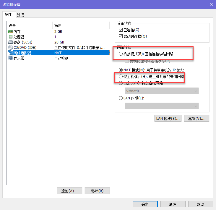 我们开启虚拟机后,点击右下角的电脑小图标进入设置,改为桥接或者仅主机模式也是可以的(网卡配置文件默认的情况下,也就是DHCP自动获取IP的情况),静态 IP 就必须使用 NAT。