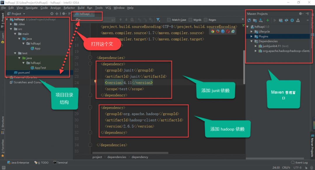 使用 IDEA 创建 maven 项目后,需要先配置我们需要的依赖,这里我使用 hadoop2.6.5。