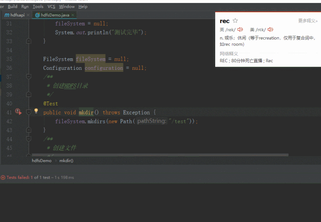 光标移到 mkdir() 方法出,右键点击 Run‘mkdir()’,当看到,绿条出现的时候说明执行成功了,出现红条说明没有成功。执行成功后就可以使用命令到 安装了Hadoop的服务器 中查看效果了。后面的方法都可以这样一个个操作运行来进行测试。
