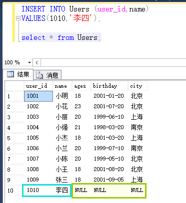 上述指定案例中,只指定了ID和姓名,其他字段没有赋值,所以是NULL。