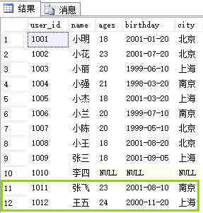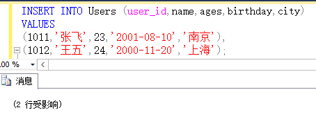 INSERT INTO Users (user_id,name,ages,birthday,city)VALUES(1011,'张飞',23,'2001-08-10','南京'),(1012,'王五',24,'2000-11-20','上海');