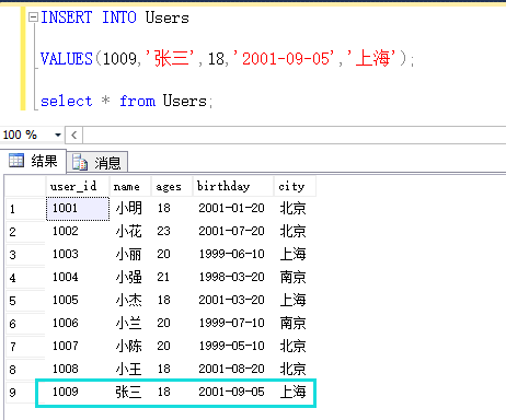 INSERT INTO UsersVALUES(1009,'张三',18,'2001-09-05','上海');