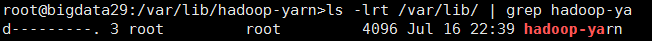 root@bigdata29:/var/lib/hadoop-yarn>ls -lrt var/lib/ | grep hadoop-ya d---------. 3 root root 4096 Jul 16 22:39 hadoop-yarn |