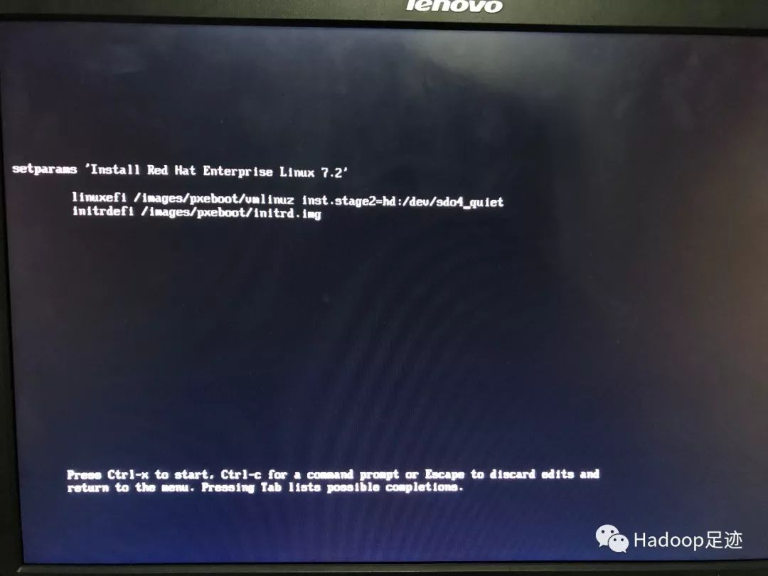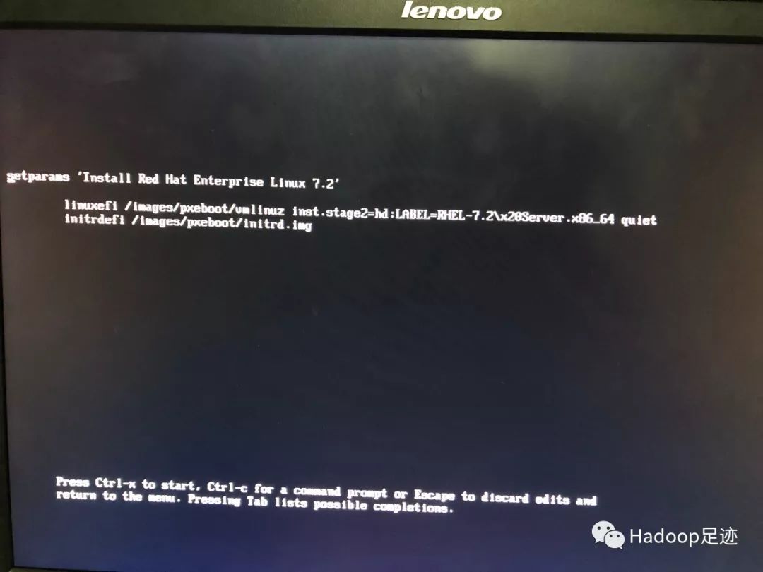 4、默认路径是“inst.stage2=hd:LABEL=RHEL-7.2\x20Server.x86_64”,这里需要更改为U盘启动盘的盘符。