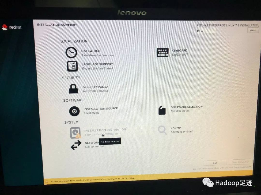 4、返回“INSTALLATION SUMMARY”界面后,点击“INSTALLATION DESTINATION”按钮,定义操作系统安装在哪块磁盘上。