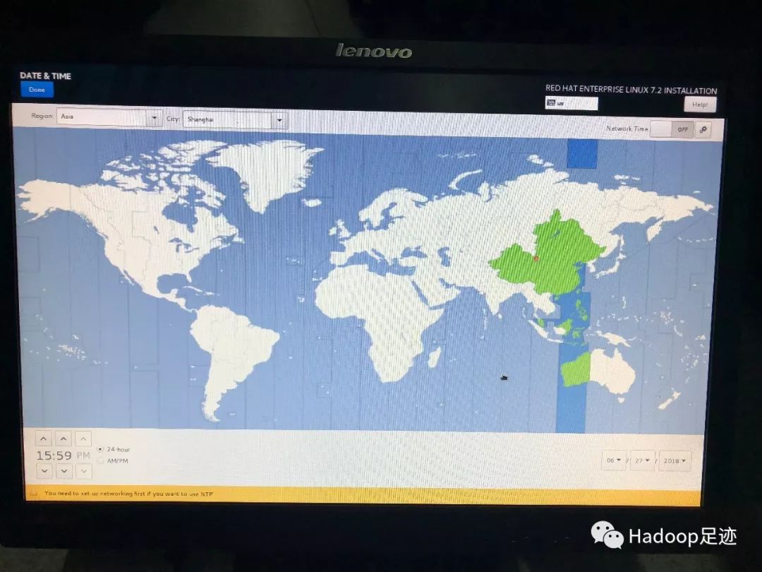 3、在“INSTALLATION SUMMARY”界面点击“DATE & TIME”按钮,更改时区、日期及时间。这里时区选择中国上海,安装系统的日期是06/27/2018,时间为15:59 PM。上述内容可依据实际情况自行修改,确认无误后,点击左上角的“Done”按钮,即表示配置完成,返回“INSTALLATION SUMMARY”界面。