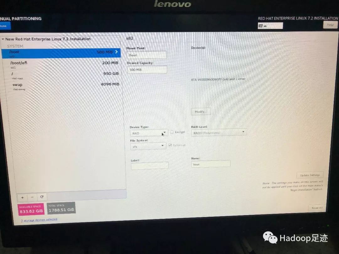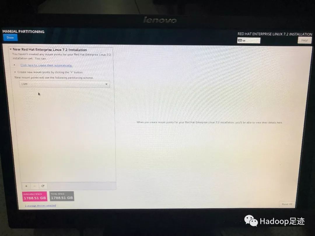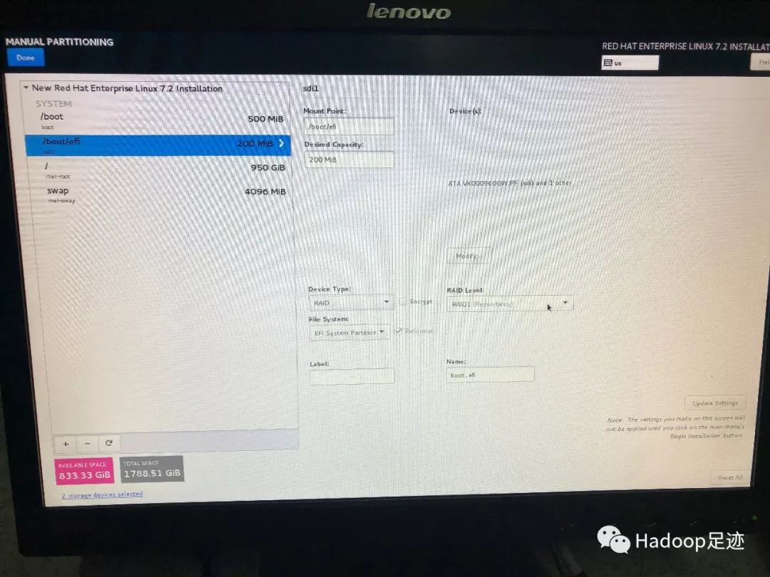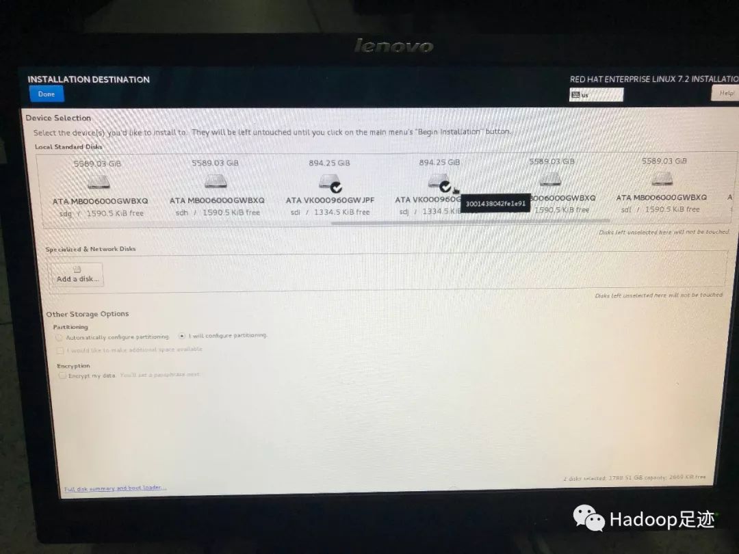6、如果操作系统不需要做RAID 1,只勾选一块磁盘安装即可,后续配置RAID 1 步骤可跳过。由于我们这里需要为操作系统配置RAID 1,所以需要勾选SSD盘对应的两块磁盘,再勾选下面的“I will configure partitioning”单选按钮,点击左上角的“Done”,进入手工配置分区界面。