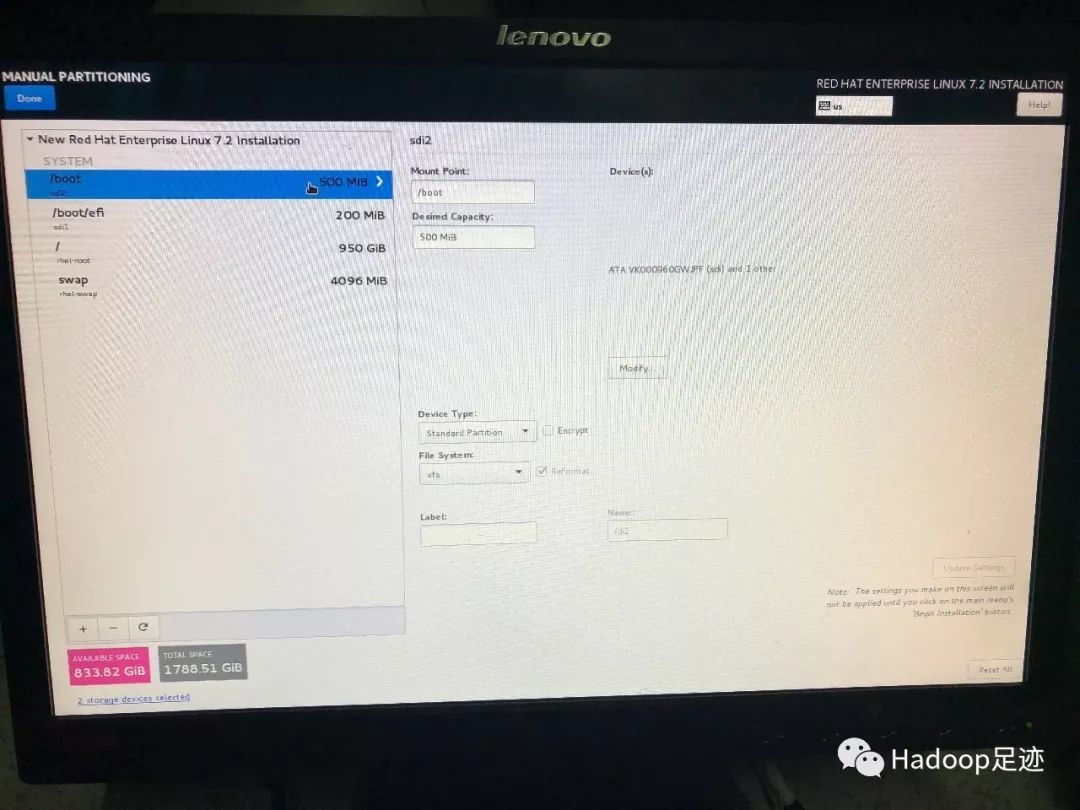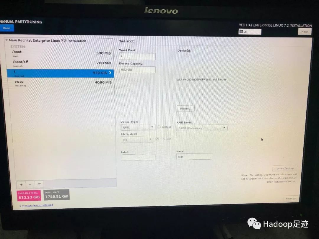 8、下面是我定义的分区,可供参考。“/”配置950GB是为了偷懒,不想去计算磁盘剩余可用容量,实际整块磁盘容量都达不到950GB,当分区定义的容量超出磁盘可用容量后,会优先满足小容量的分区,然后把剩余容量分配给超额分区。