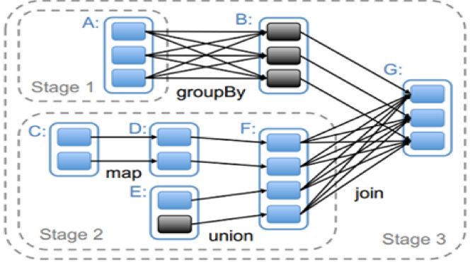 根据RDD依赖关系的不同,Spark将每一个job分为不同的stage,stage之间的依赖关系形成了DAG图。具体来讲就是: