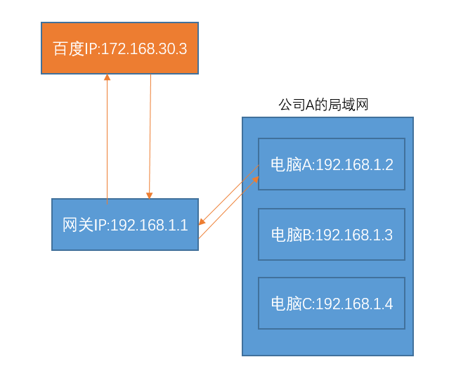 为了让 A 可以访问百度,那么我们可以采取这样的方法:让网关去帮助 A 访问,然后百度把结果传递给网关,而网关再把结果传递给 A,这样不就可以解决了?