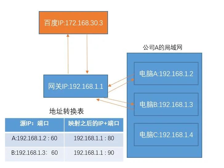 不过电脑A, B, C都可能拜托网关去帮忙访问百度,而百度返回的结果 的目的IP都是网关的IP=192.168.1.1。那么网关该如何进行区分这结果是A的,B的还是C的呢?