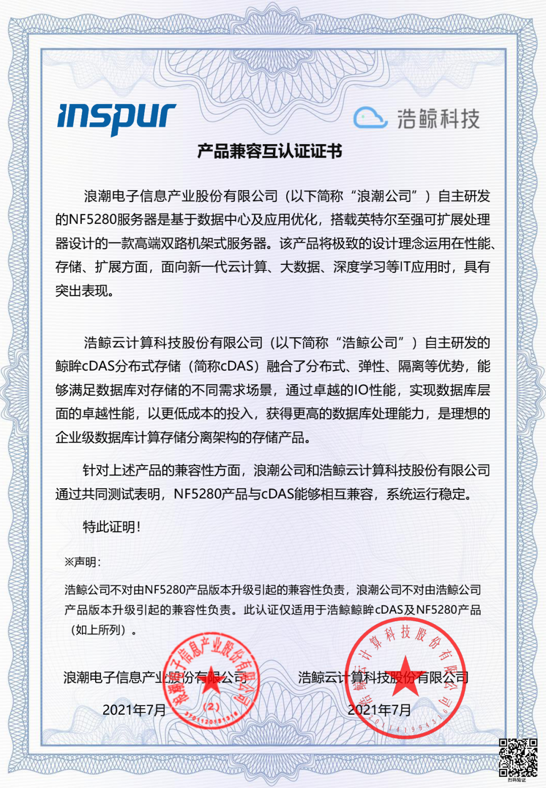 作为自主核心软件领域的代表性企业,此次鲸眸cDAS分布式存储与浪潮NF5280产品兼容性互认证测试,充分展示了国产信息化建设及生态协同发展,共同打造新的生态体系。