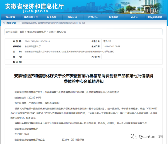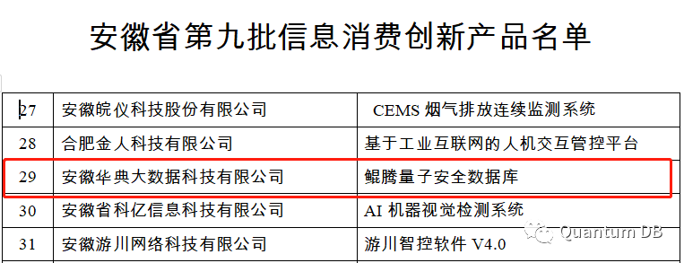 10月11日,安徽省经济和信息化厅公布了第九批信息消费创新产品名单的通知,经申报推荐、专家评审等程序,确定安徽华典大数据科技有限公司的鲲腾量子安全数据库为安徽省第九批信息消费创新产品之一。