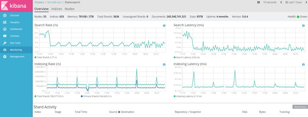 索引信息、集群整体信息很有帮助,尤其是各索引的索引、搜索速率,索引延迟数据等。其中,X-Pack 是官方给出的插件(Monitoring 为开放特性),需要注意的是,ES 集群上线前就需要安装 X-Pack 插件。图一展现了在 Kibana 中,Monitoring 的部分功能。