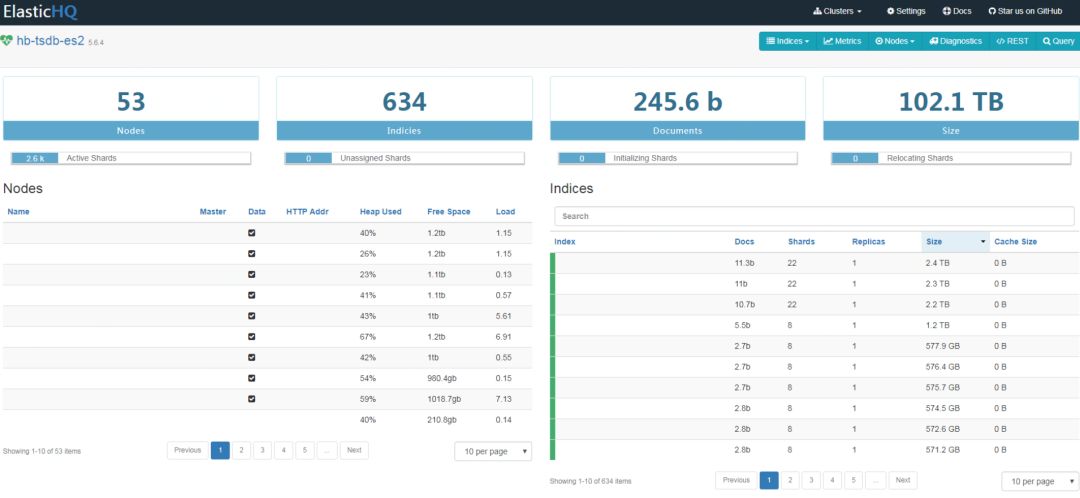 这款工具属于清新风格。之前使用的 head 插件,在集群规模达到一定程度后,head 插件信息展现不理想,因此使用了 HQ 代替 head 部分功能。如果很难记住管理 API,可以借助 ES-command 工具。图三展现了 ElasticHQ 管理界面。
