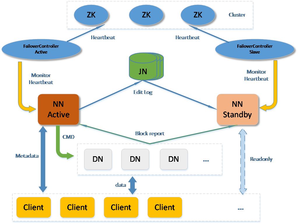 为了保证NN的高可用,衍生出Active NN和Standby NN,依托ZooKeeper(以下简称ZK)实现NN的状态切换。ActiveNN对外提供服务,Standby NN在Active NN发生故障时切换为Active NN继续对外服务。