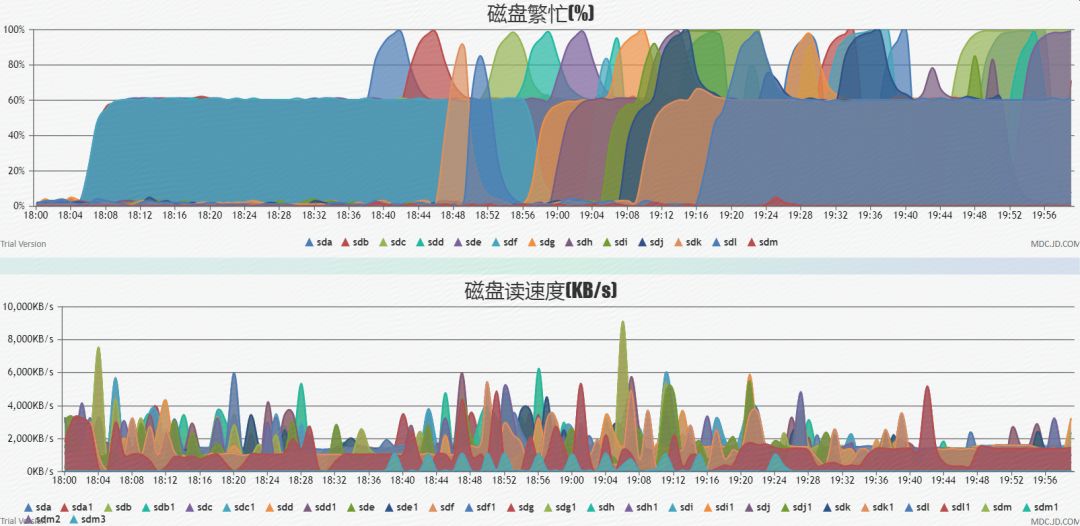 优化后,在DataNode的扫盘/错误检查/du等操作期间,磁盘繁忙度未出现突出变化,磁盘读吞吐保持平稳,在磁盘不繁忙的情况下,保持在10MB/s。