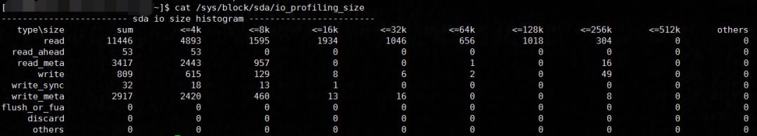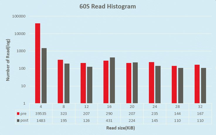 下图横坐标代表读请求的大小,单位为KB,纵坐标为读次数。在1分钟统计时间内,4KB小块读的次数下降了27倍。