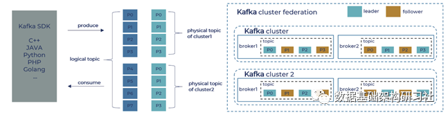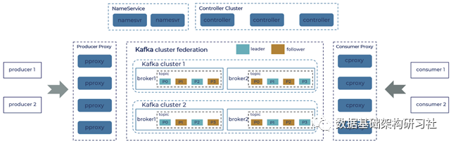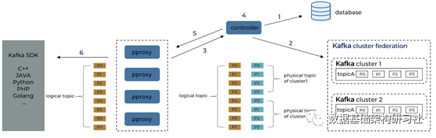 为了处理这组代理broker,我们构建了一个轻量级命名服务来维护客户端ID和代理服务器集合之间的关系。SDK将在通信开始时使用客户端ID请求一次代理broker列表。在内部,我们实现的最复杂、最庞大的部分涉及管理联邦集群的元数据,包括主题状态和代理节点的生命周期。我们将Kafka控制器节点的逻辑(如主题元数据)提取到一个单独的服务中,该服务也称为“控制器”,但它不同于Kafka自己的控制器功能。此服务负责收集物理集群的元数据,构建分区信息逻辑主题,然后将其发布给代理broker。