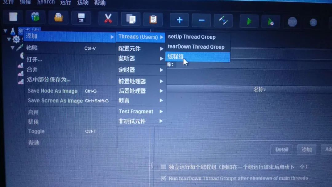 在测试计划右键弹出下拉菜单(添加–>Threads(Users)—>线程组)中选择线程组即可。
