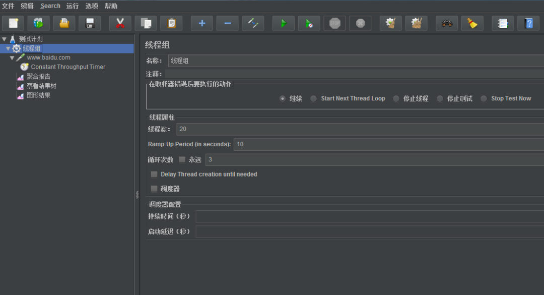 设置合理的循环次数也很重要,除了上面介绍的固定循环次数与永远外,也可以灵活的选择设定测试运行时间,勾选“调度器”,进行调度器配置