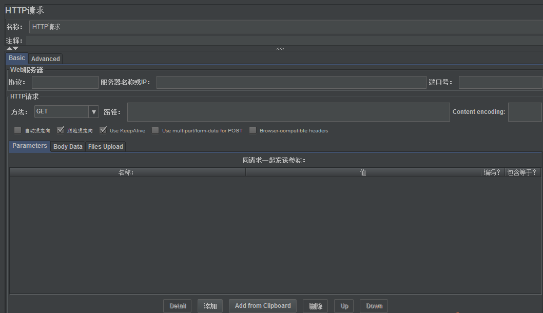从HTML文件获取所有有内含的资源:当该选项被选中时,jmeter在发出HTTP请求并获得响应的HTML文件内容后,还对该HTML进行Parse 并获取HTML中包含的所有资源(图片、flash等),默认不选中,如果用户只希望获取页面中的特定资源,可以在下方的Embedded URLs must match 文本框中填入需要下载的特定资源表达式,这样,只有能匹配指定正则表达式的URL指向资源会被下载。