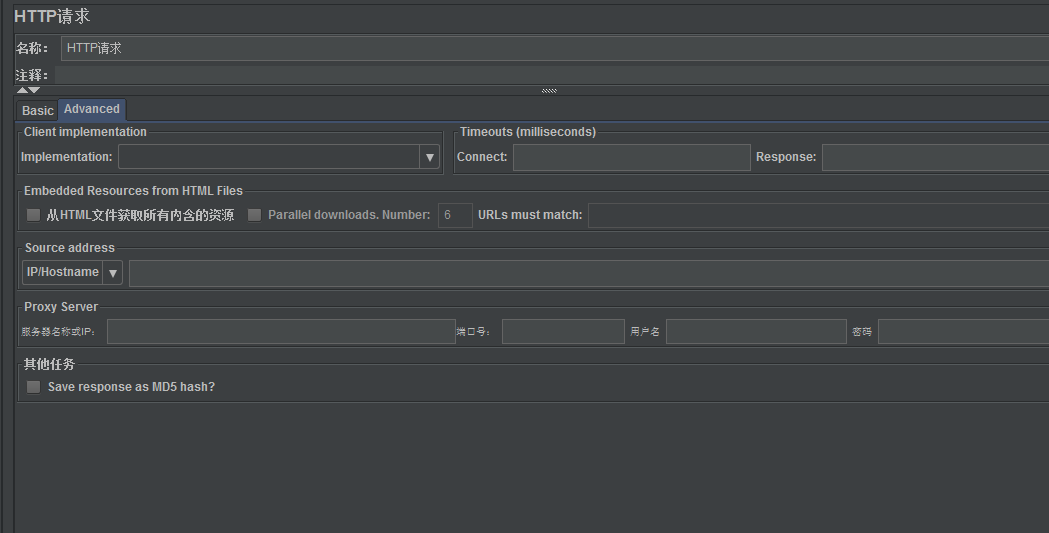 Save response as MD5 hash? :选中该项,在执行时仅记录服务端响应数据的MD5值,而不记录完整的响应数据。在需要进行数据量非常大的测试时,建议选中该项以减少取样器记录响应数据的开销。