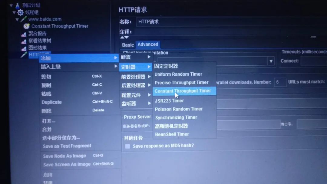 右键点击http请求 ,弹出菜单(添加—>定时器—>Constant Throughput Timer)选择Constant Throughput Timer