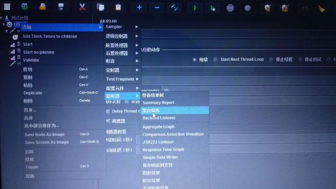 添加聚合报告,右键点击线程组,在弹的菜单(添加—>监听器—>聚合报告)中选择聚合报告。