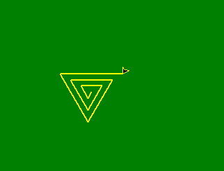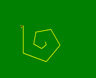 #画图import turtleturtle.screensize(400,300,"green")turtle.pencolor("yellow")turtle.pensize(2)for i in range(10):turtle.forward(i*10)turtle.right(120)#turtle.right(70)turtle.done()