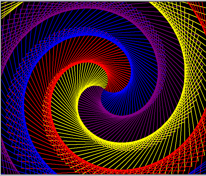 #彩色图import turtleimport timeturtle.pensize(2)turtle.bgcolor("black")colors = ["red","yellow","purple","blue"]turtle.tracer(False)for x in range(400):turtle.forward(2*x)turtle.color(colors[x % 4])turtle.left(91)turtle.tracer(True)time.sleep(20)