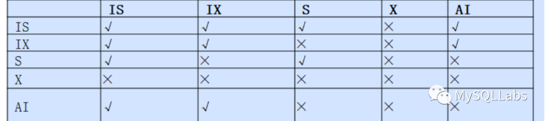 static const byte lock_compatibility_matrix[5][5] = {/** IS IX S X AI *//* IS */ { TRUE, TRUE, TRUE, FALSE, TRUE},/* IX */ { TRUE, TRUE, FALSE, FALSE, TRUE},/* S */ { TRUE, FALSE, TRUE, FALSE, FALSE},/* X */ { FALSE, FALSE, FALSE, FALSE, FALSE},/* AI */ { TRUE, TRUE, FALSE, FALSE, FALSE}};