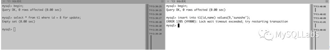 图中展示了两个事务同时对表t1中的主键索引记录10添加排他间隙锁的情况,可以看到是不冲突的。但是如果第二个事务带有插入意向属性,则不兼容,进入锁等待,如下图所示: