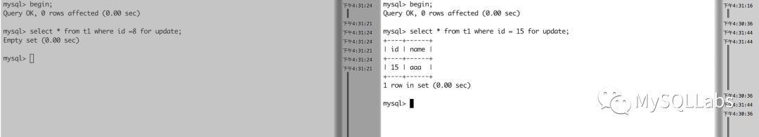 左侧事务操作对t1表中的主键索引记录15添加排他间隙锁的,右侧事务对t1表中的主键索引记录15添加记录锁,两锁兼容。
