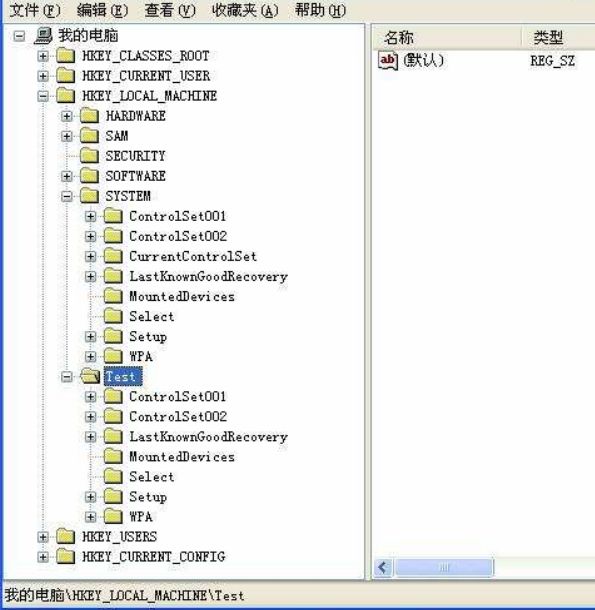 多出了一个 Test 键,这个键跟 System 键的内容是一样的,因为我们复制的就是 System 注册表文件:Test 里面少了这个键“CurrentControlSet”,再看看他的名字“ Current- Control- Set”,键也是个链接键,是从 ControlSet001 与 ControlSet002 中链接的内容,是“当前的”设置。所以,文件中是没有的。而注册表编辑器是从内存中读取的注册表内容,因此是有的。