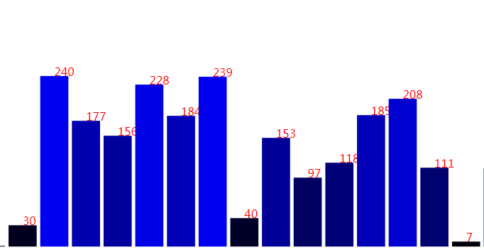 <!DOCTYPE html><html lang="en"><head><meta charset="UTF-8"><title>javascript直方图</title></head><body>this is a javascript<svg id="svg01" width=800 height=600><!--<rect x="10" y="10" width="200" height="300" fill="blue"/>--><!--<text x="20" y="20" fill="red">hello</text>--></svg><script>var w = window.innerWidth|| document.documentElement.clientWidth|| document.body.clientWidth;var h = window.innerHeight|| document.documentElement.clientHeight|| document.body.clientHeight;w=w*0.98;h=h*0.98;var svg=document.getElementById("svg01");svg.setAttribute("width",w);svg.setAttribute("height",h);var rec=new Array();var txt=new Array();for(var i=0;i<30;i++){rec[i]=document.createElement("rect");txt[i]=document.createElement("text");svg.appendChild(rec[i]);svg.appendChild(txt[i]);var rec_h=Math.floor(Math.random()*255);rec[i].outerHTML="<rect x="+(i*w/30)+" y="+(400-rec_h)+" width="+(w/30-5)+" height="+rec_h+" fill='rgb(0,0,"+rec_h+")'>"txt[i].outerHTML="<text x="+(i*w/30+(w/30-5)/2)+" y="+(400-rec_h)+" fill='red'>"+rec_h+"</text>"}</script></body></html>