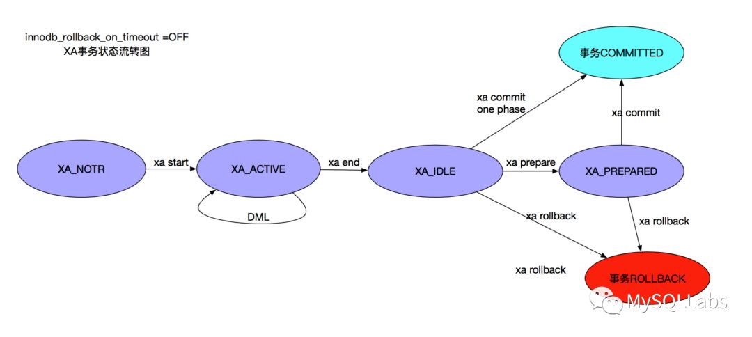 事务状态流转受到InnoDB参数innodb_rollback_on_timeout的影响,这一点会在下一篇文章中解释,关于MySQL XA事务处理的内部细节,也会放在后续的文章中。