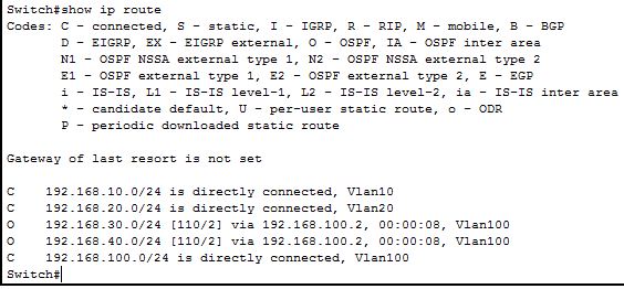 Switch(config)#ip routingSwitch(config)#router ospf 13Switch(config-router)#network 192.168.10.0 0.0.0.255 area 0Switch(config-router)#network 192.168.20.0 0.0.0.255 area 0Switch(config-router)#network 192.168.100.0 0.0.0.255 area 0Switch(config-router)#exitSwitch(config)#exitSwitch#show ip route