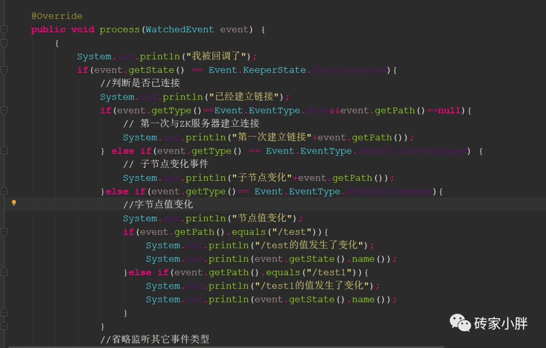 WatchEvent.getType可以判断ZK节点服务端的不同监听事件,这玩意和Java Swing的ActionListener和Android开发的OnClickListener差不太多。